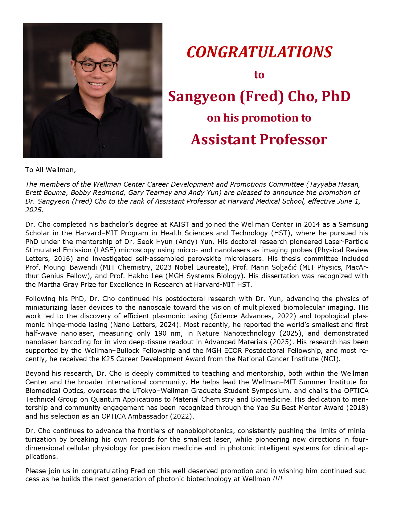 We are thrilled to announce that Dr. Fred Cho has been promoted to Assistant Professor. Please join us in congratulating him on this well-deserved achievement. We look forward to his continued success and the exciting contributions ahead!